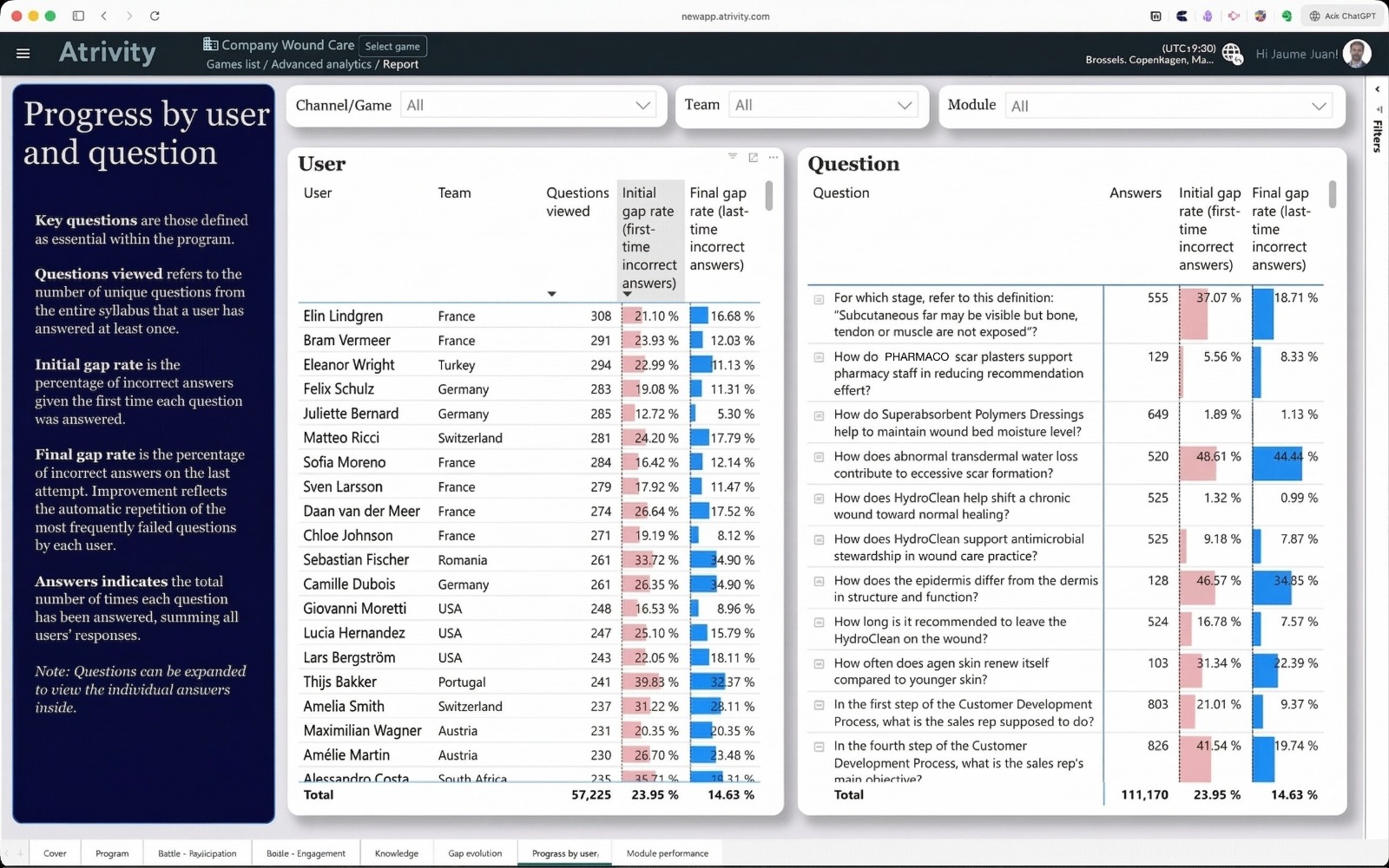 Atrivity provides deep knowledge analytics, per test question, category knowledge, user and teams, identifying critical gaps and solving them automatically by sending back gap-fixing content only to the appropriate users.