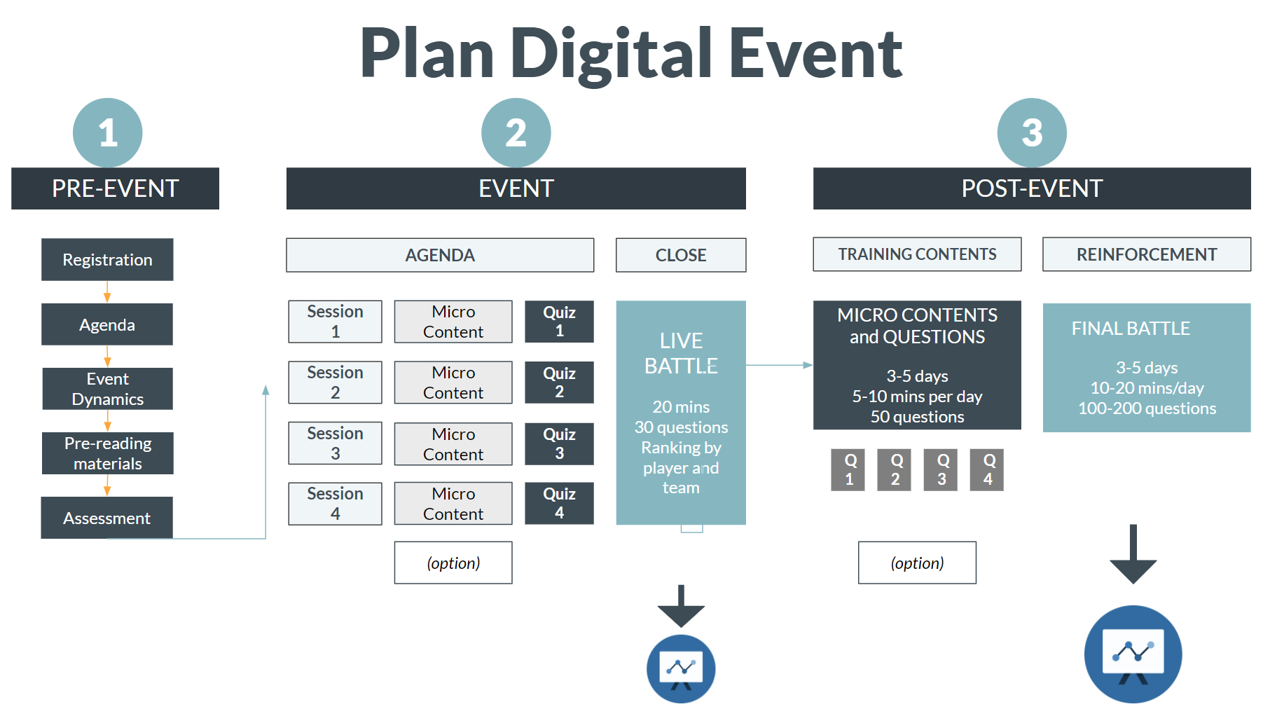 •Post-event: Reinforce content with follow-up challenges and knowledge reinforcement, minimizing the forgetting curve and capturing data for future training analytics pharma.