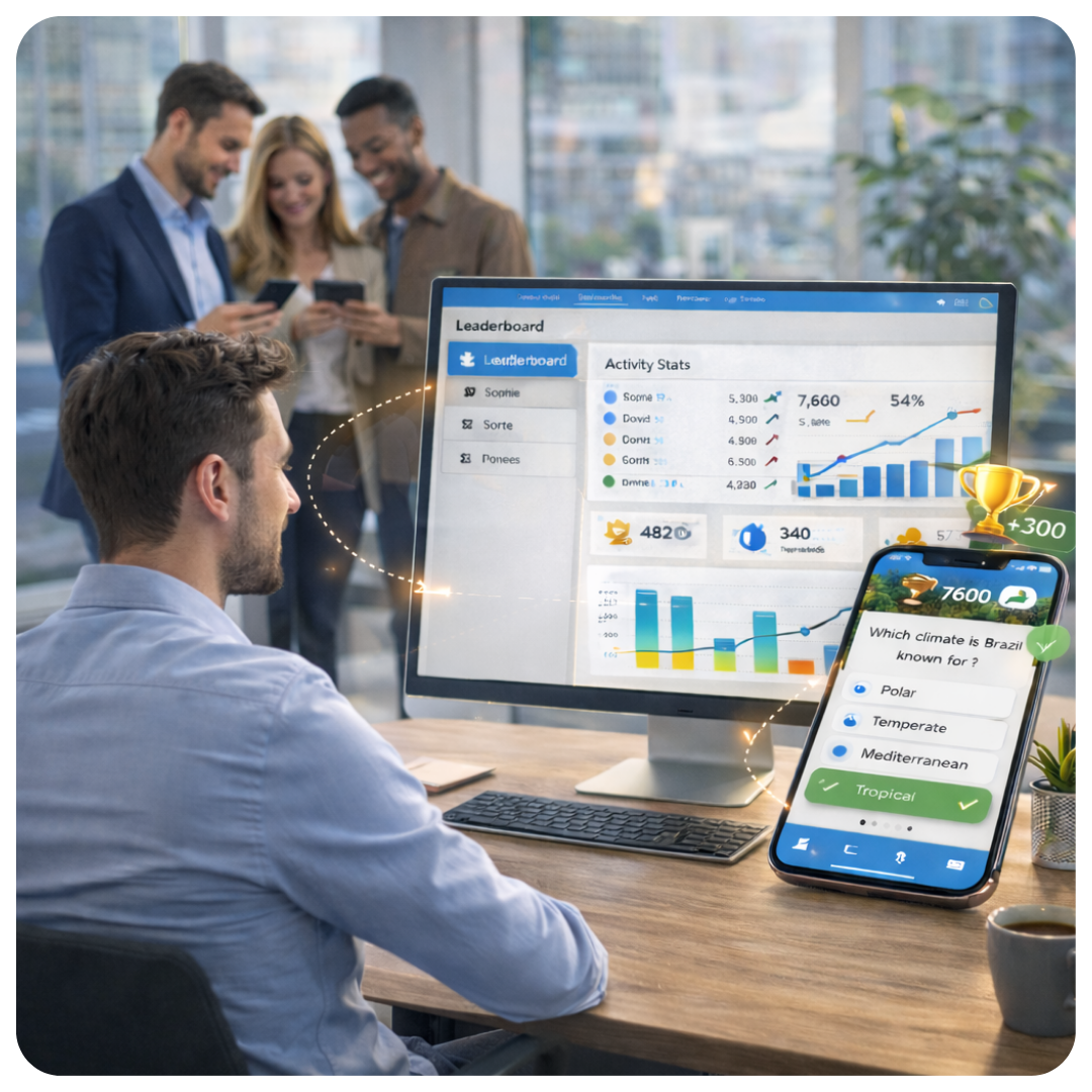 Monitor rich analytics in the web interface while players use their phones and tablets to compete in trivia matches. The in-game leaderboard and game-like features keep the competition going and engagement high.